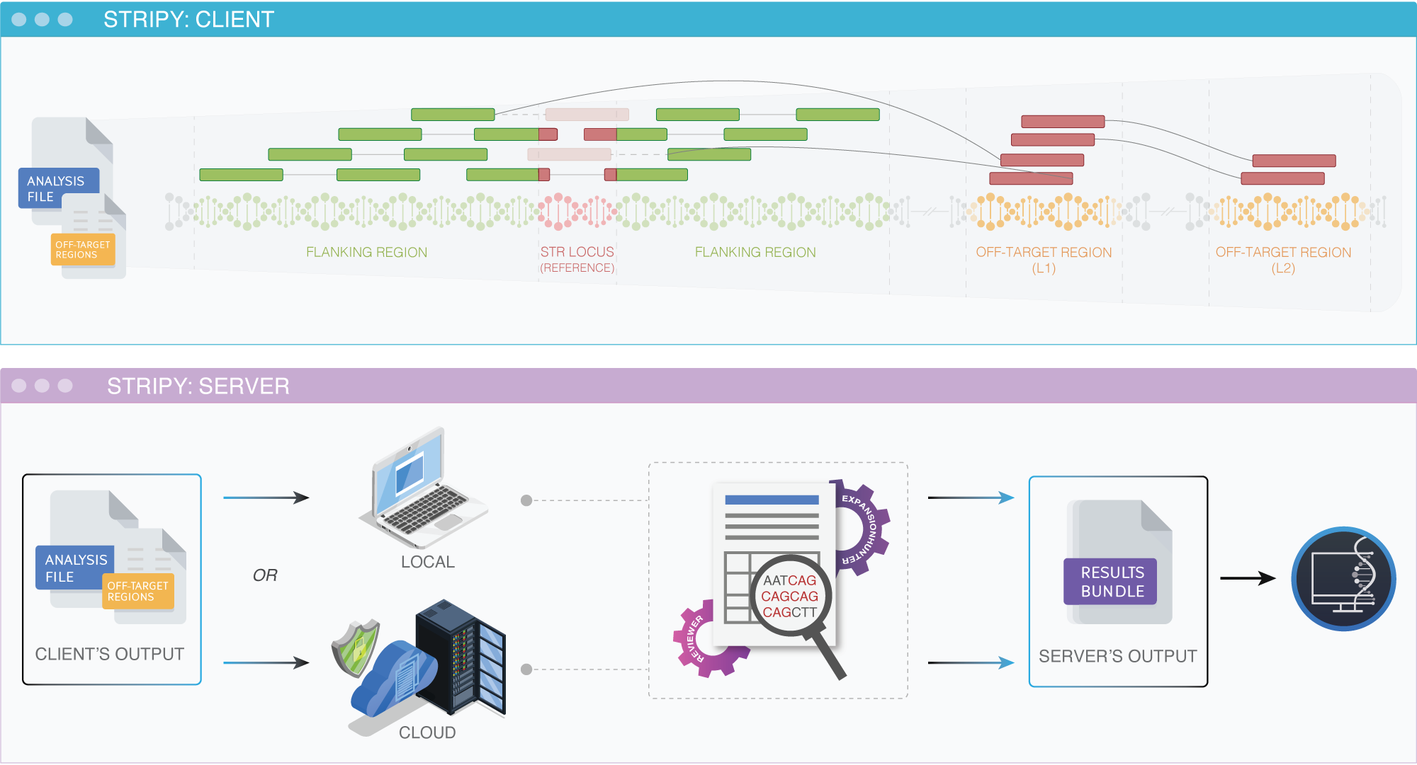 STRipy uses ExpansionHunter (Dolzhenko, et al., 2017) to determine genotypes and REViewer (Dolzhenko, et al., 2021) for visualizing read alignments. From a sequencing file, STRipy extracts out a small fraction of reads that are relevant to the targeted locus and coordinates of mis-mapped reads (if they exist). The output data is then forwarded to specialised tools for genotyping and creating read visualisations.